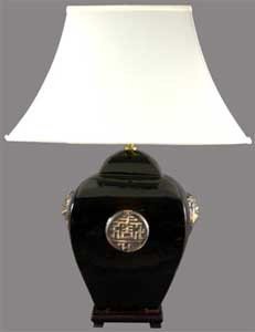 Finely crafted porcelain oriental lamp - beautiful large square spice jar, high gloss black glaze w/ unique Asian Shou symbol (long life) medallions, elegant dark hardwood base, fine white sateen fabric pagoda shade as shown, decorative brass finial, UL approved 3 way switch, wiring and socket, for standard 3 way & single filament light bulbs, ships in 48 hours professionally packed fully & insured from our Massachusetts warehouse via Fed Ex Home delivery, expedited delivery available.