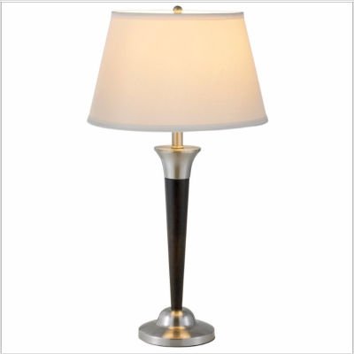 Each Alta lamp has a tapered wood body ith satin steel accents. Natural colored faux silk shade. On/off socket switch. Takes one 100-watt incandescent or one 26-watt CFL bulb (not included). 26-1/2-inch Height, 6-inch round base. Shade: 8-1/2-inch Height, 14-inch Bottom diameter, 10-inch Top diameter.