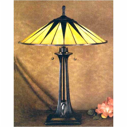 The hand-cut iridescent art glass is alternated to form a slender triangle pattern in shades of rich ebony and warm yellow. Simply stunning. Base has an art deco form. From Quoizel Lighting. Takes two 75 watt medium base bulbs (not included). Antique bronze finish. 25" high. 19" wide. Hand-cut iridescent art glass.