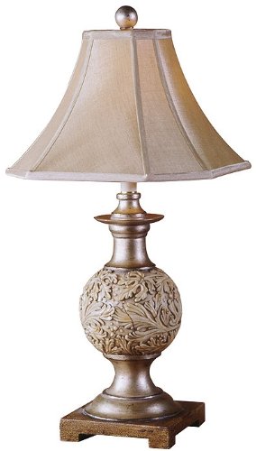 This lovely table lamp features a leaf pattern finished in bone ivory. It is accented in silver leaf on a cracked champagne foot. The silken textile shade is square with clipped corners. Takes one 100 watt bulb (not included). 28" high. Shade is 14" in diameter.