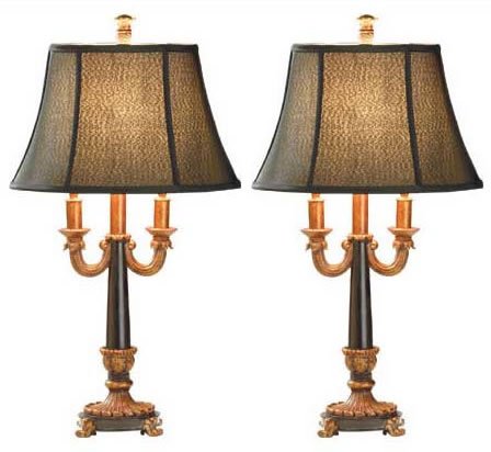 Graceful table lamp features carved, sweeping arms topped with an elegant black fabric shade. UL recognized. Bulb not included. Polyresin 14" x 7 1/2" x 24" high. Set of 2. **Alabastrite, also known as polyresin, is fashioned by combining oxylite and polystone to form a stone-based material. This unique combination allows the sculpting mastery of the artisan to be captured in intricate detail in each handsomely finished product.
