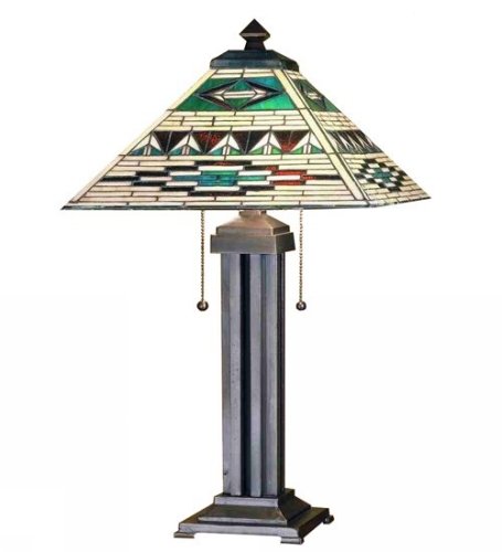 Color Theme: Ebna Amber BeigeCollection: Mission SouthwestPatterns and colors of native american blankets and pottery have given inspiration to this meyda tiffany designed mission style stained glass shade. The intricately patterned shade of bark brown granite glass with sand beige and turquoise is bined with a clean lined mission style table lamp base that has an earth toned mahogany bronze hand applied finish. Unless otherwise noted within product description item ships in 5-9 business days.