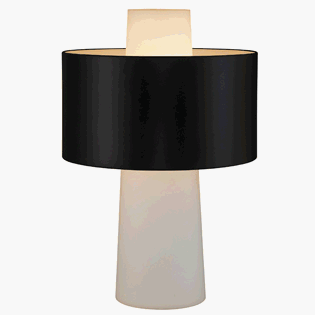 The metal shade surrounds a frosted glass cylinder with a black shade. It is attached to the cylinder with three chrome rods that insert into holes in the glass. The shade is placed at 12-inch from table top and 3-1/2-inch from top of cylinder. The cylinder sits flat on table top and has a small cut-out at bottom from which the cord extends. Glass Cylinder: 24-inch Height, 7-1/2-inch Bottom diameter, 5-inch Top diameter.