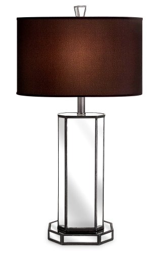 7501 Features: Contemporary mirror base table lamp Deep brown fabric shade Mirrored finial Material: Glass 40 , Steel 20 , Poly resin 30 , Fabric 10 Food Safe: no Dimensions: 15.5"(W) x 9"(D) x 30"(H)