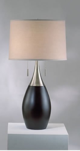 Sophisticated and modern make the best combination when it comes to design. The brushed nickel finish accents blend into the graceful dark brown wood base, giving it a striking look. Two nickel pull chains allows for easy light adjustment. A tan linen shade tops the light for a soft and classic look. Brushed nickel finish. Dark brown wood. Tan Linen shade. Dual pull chains. Takes two 60 watt medium base bulbs (not included). 30" high. Shade is 15" across top, 16" across bottom, 11" high.