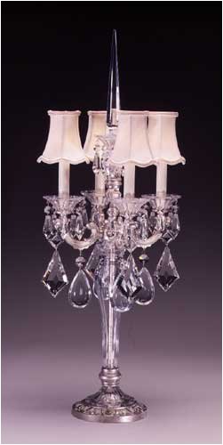 Four Light Table Lamp from the La Scala CollectionThese crystal candelabra complement our Baroque-style La Scala cast arm crystal chandeliers. They are ornamented with Heritage Handcut crystal. We offer La Scala chandeliers and candelabra in a variety of finishes.Four light up lighting candelabra table lampAvailable with Handcut, Optic Handcut, Swarovski Spectra, or Teak crystal optionsRequires 4 60w Candelabra base bulbs (not included)