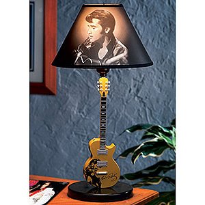 A hunk of shining light perfect to jazz up your bedroom, living room or rec room! Handsome images of The King's '68 Comeback Special decorate the high-gloss film-style lamp shade and miniature guitar base.